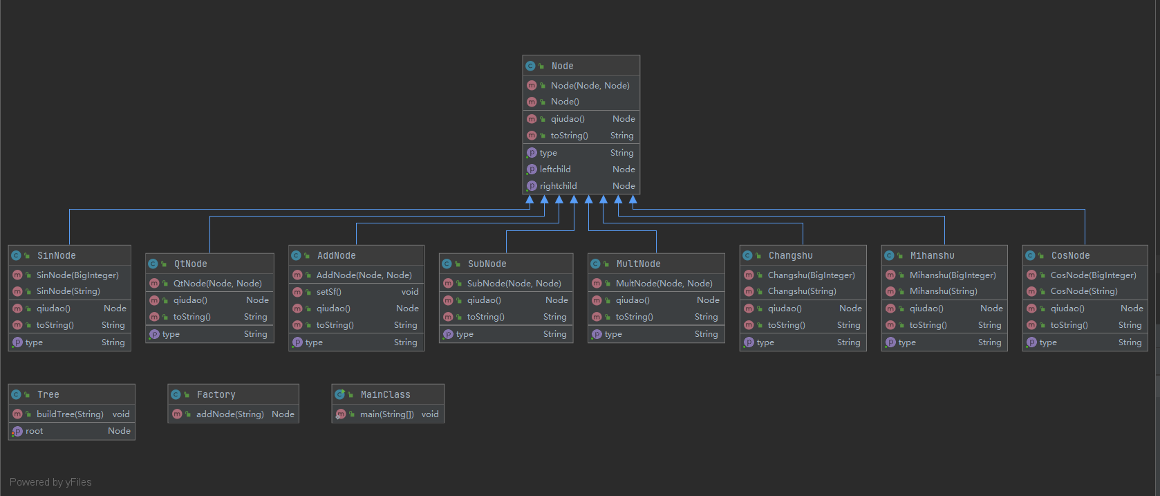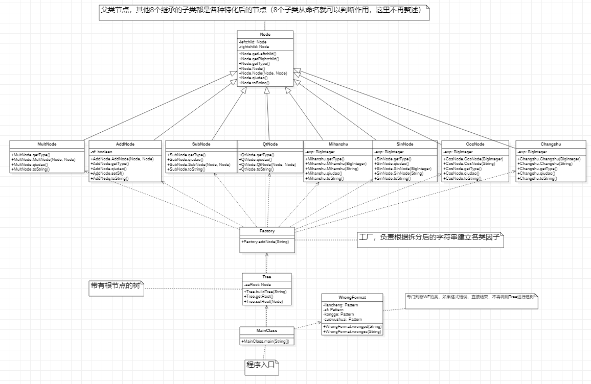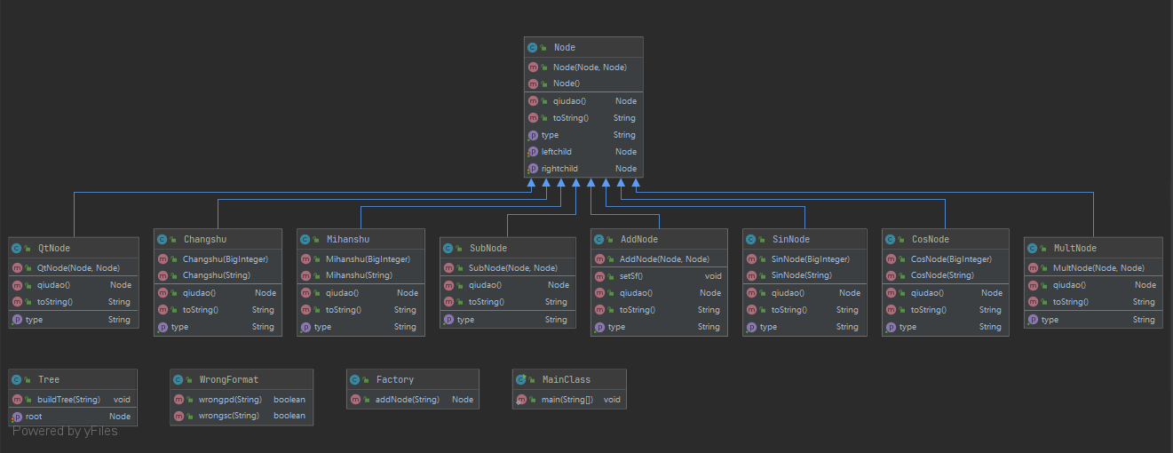 由上图可以看出,Factory,Mihanshu,CosNode,SinNode这四个类较为复杂,究其原因,是因为Factory要判断因子的种类进而创建,而另外三个类的新建、求导、输出涉及各种判断。