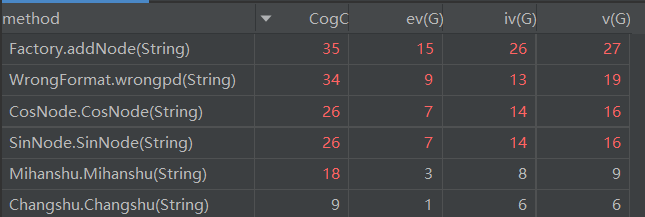 由上图可以看出,对应于上文已经分析的5个类,Factory.addNode(String),WrongFormat.wrongpd(String),CosNode.CosNode(String),SinNode.SinNode(String),Mihanshu.Mihanshu(String)这五个方法的复杂度十分不理想。因为它们都调用了大量的其他方法,WrongFormat.wrongpd(String)调用了大量的条件判断以及判断函数等,而其他几个调用了不同节点的构造方法,也拥有大量的判断。
