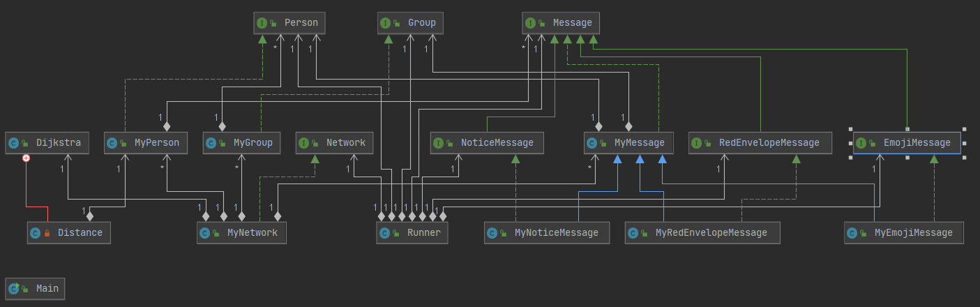 从总体架构上看,这次作业的架构比较清晰。NetWork作为一个容器和管理者,管理了Group,Message,Person三个类。Runner作为与外界交互的类,如果需要进行操作的话只能调用NetWork中的方法。然后由NetWork根据自身的方法调用其管理的Group,Message,Person对象进行相应计算,然后给出相应的结果。Group的作用是将NetWork中的Person进行划分形成子图。