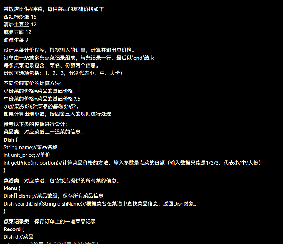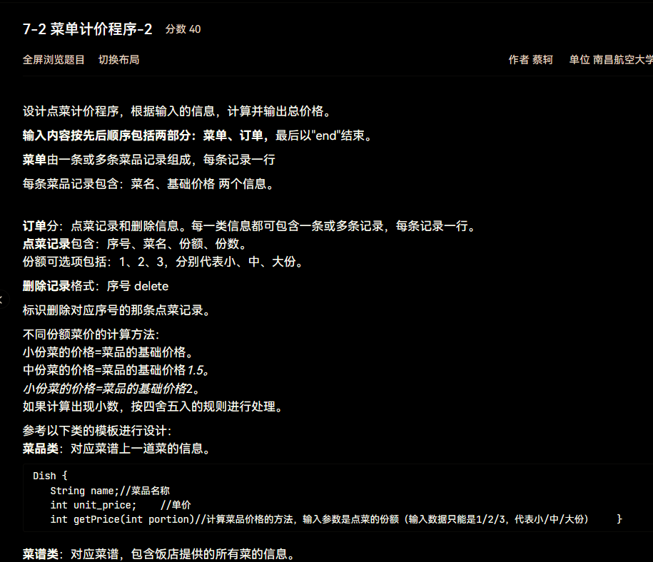 这一题在第一题的基础上加了查找订单,删除订单的概念,即客户可以删除已点菜的信息,包括对点菜记录的删除,价格的不再计算,查找订单实际上就是为删除订单服务的方法,还有对于没有该订单的记录,会显示删除失败的信息,实则就是利用查找序号的功能查询,最后同样输出总价格,所以对删除价格的处理,我是将要删除的订单的价格加在另外一个数组中,然后减去这个和,就是最后的总价格,以上就是我对第二题新增的内容的理解了,很遗憾没有完成全部测试点;