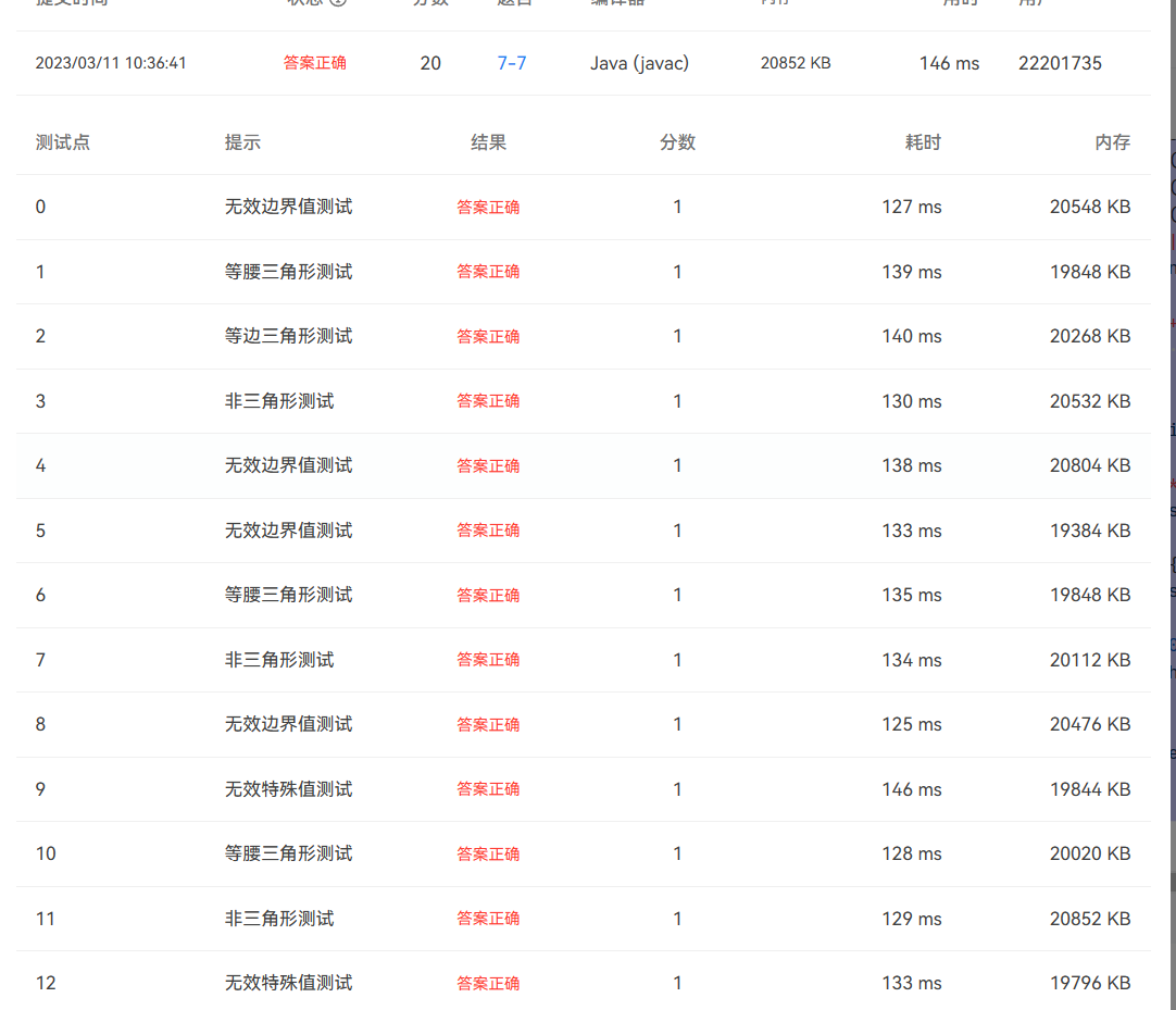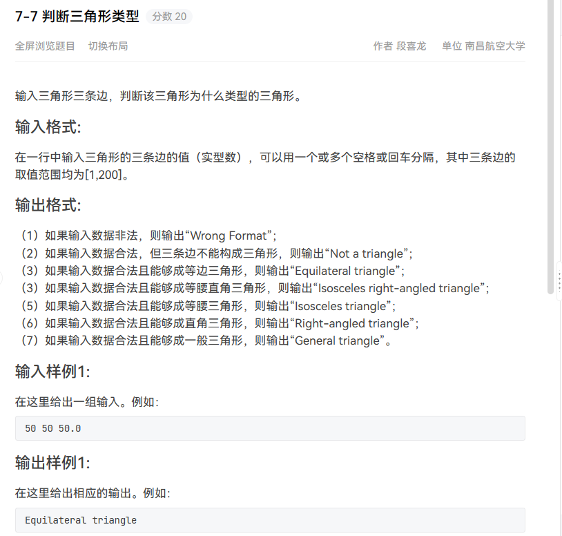这道题虽然放在最后一题,但是却是我比较早做完的一道题,主要因为逻辑很清晰,只要对三角型的满足条件做判断,什么条件对应什么类型三角形即可,也没什么注意的点;