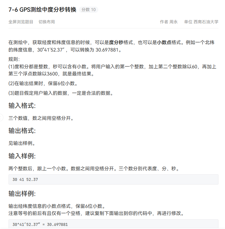 反观这一题有一点第一题的意味了,与本次大作业有点小反差,题目给出了计算方法,也给出了输入输出格式,测试点明显,唯一需要的注意的是最后输出的秒的格式,题目说的只是有小数,但是并没有说一定是几位小数,因此采用%.f格式输出是行不通的,我用的%s格式输出,这样的就巧妙避免了这个问题;
