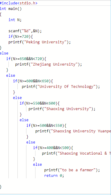 高考结束不久,各校的入取分数线也出来了,北京大学(Peking University)720,浙江大学(Zhejiang University)650,工业大学(University Of Technology)600,文理学院(Shaoxing University)550,文理学院元培学院(Shaoxing University Yuanpei College)500,绍兴职业技术学院(Shaoxing Vocational & Technical College)400,张三的分数为n,请问张三能去哪个大学? 如果分数低于400,则回家种地(to be a farmer)。很多学生都想知道自己能去哪个学校,求身为程序员的你帮帮他们。 输入格式:一个高考分数N。 输出格式:录取大学的名字或者to be a farmer。