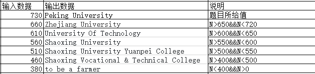 解决办法:只有第一个答案正确,其他的错误,没有考虑到不仅仅要超过那个学校的分数线,还有考虑在上一个分数线之下,如N>650&&N<720,而不是N>650就可以了。