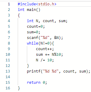 输出格式:在一行中输出N的位数及其各位数字之和,中间用一个空格隔开。