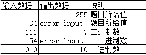 输入一组二进制字符,输出其对应的十进制数。当输入回车键时,输入结束。若输入非二进制字符,输出error input!