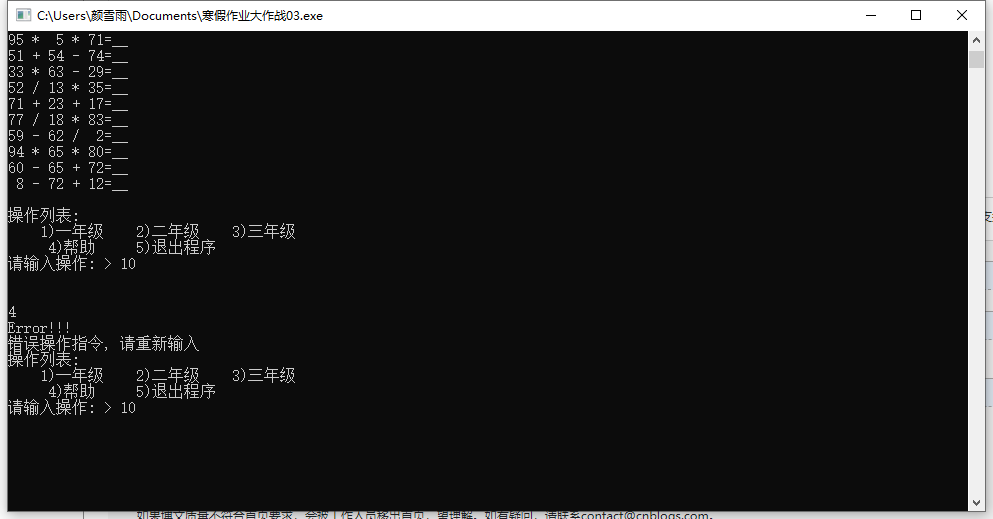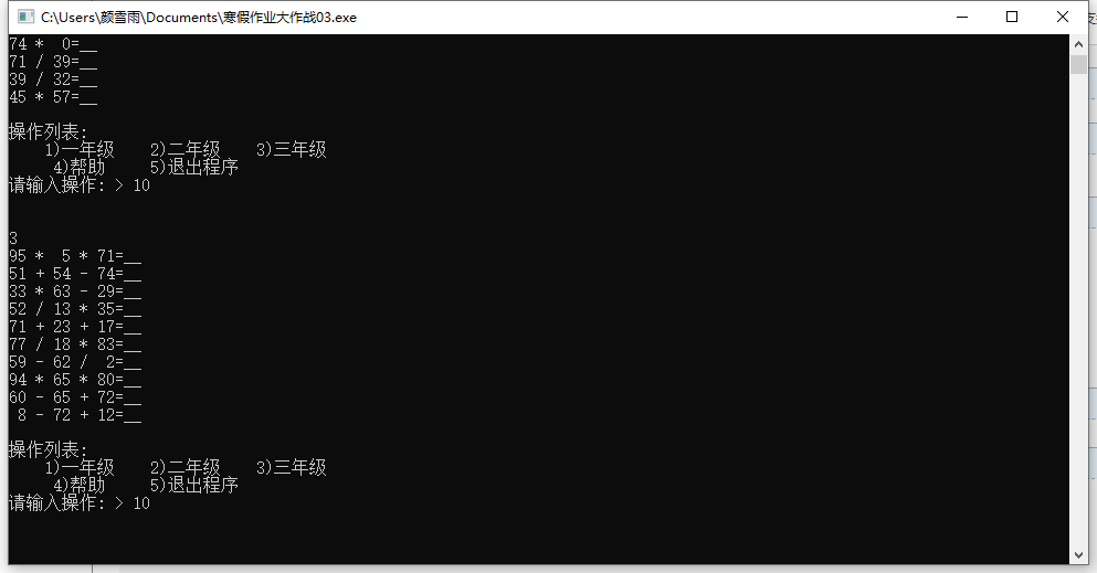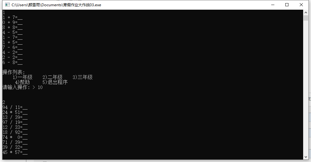 | 3.这个作业的目标 | 随机数rand的使用、使用上次作业的菜单框架,并在其基础上增加各年级题目操作函数 |