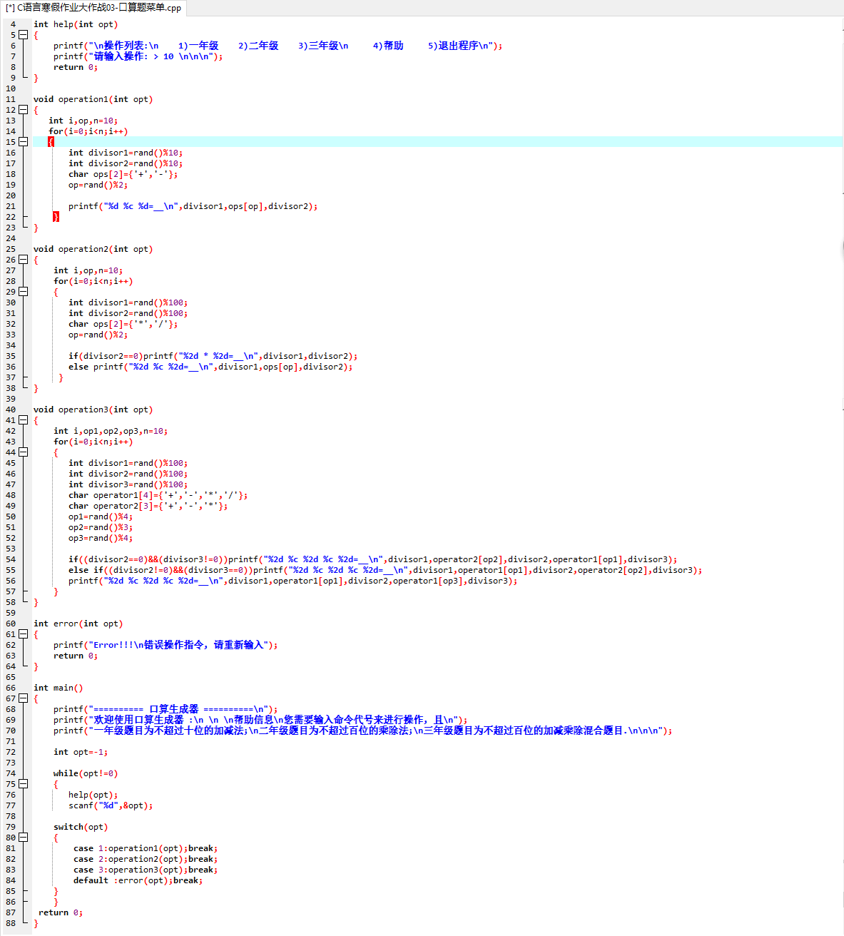 c.不知道+-*/这些怎么表示,我都是用了printf("%d+%d\n"rand()%10,rand()%10)||printf("%d-%d\n"rand()%10,rand()%10)来表示的,后面还是问了同学才知道怎么做