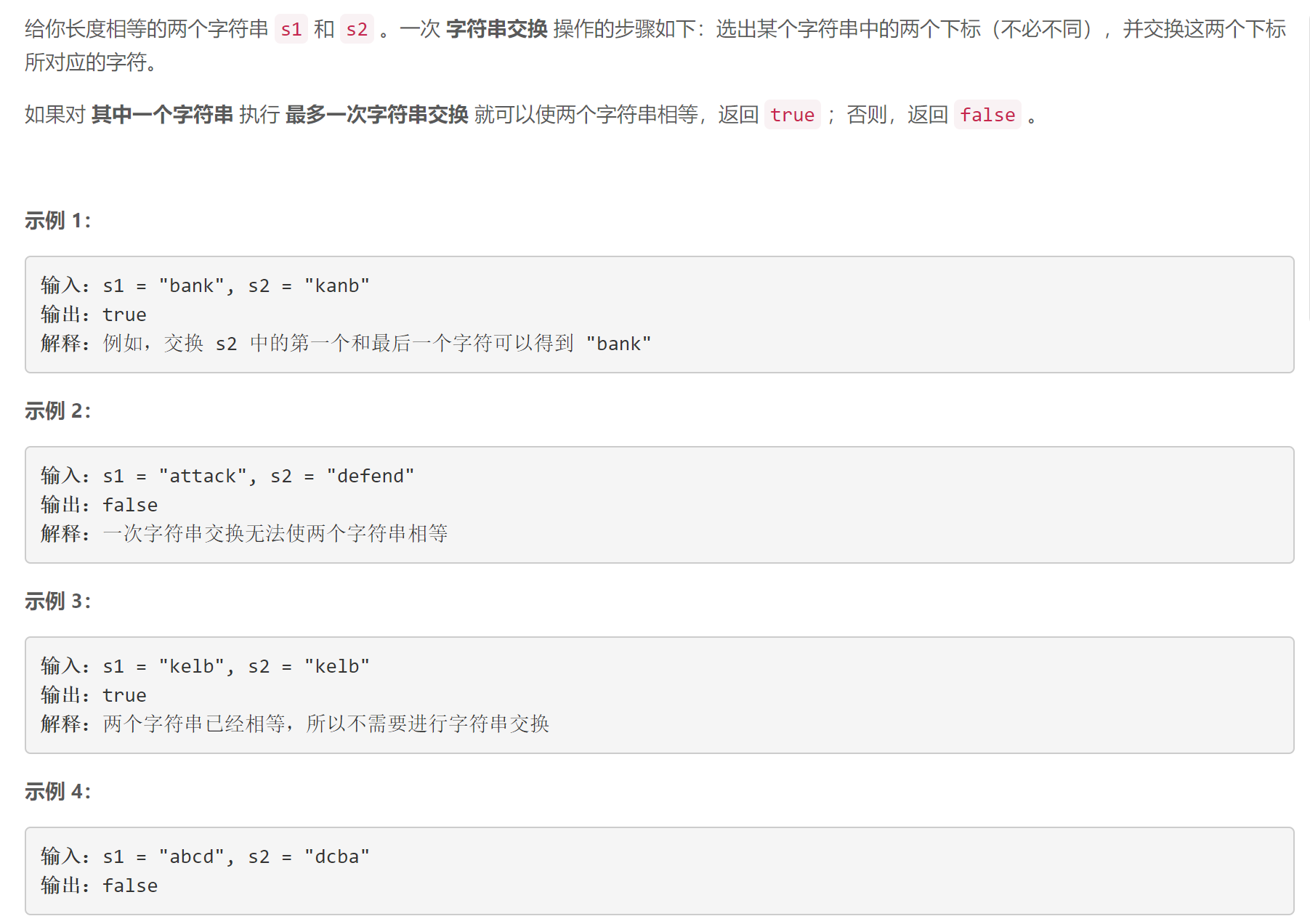 相对来说比较简单,基本上就是需要注意字符串相等的情况即可,基本上定义一个数组保存一下第n个不同的位置,然后判断如果不为2或0就是不符合要求,如果是2,则需要交换相同才可,否则不满足要求