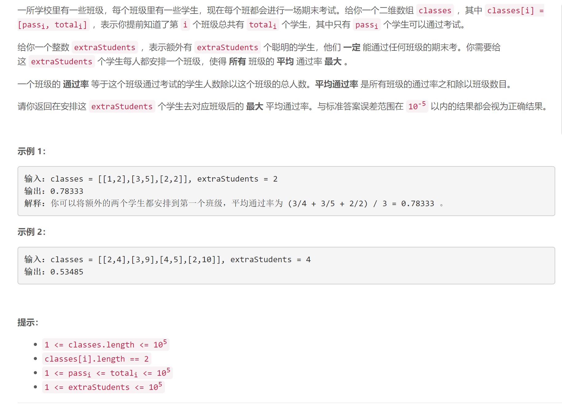 整体思路大概就是因为我们如果想要平均率的最大化,应该是优先以提高人数较少的班级为目标(理论上,可以用极限来证明),但是基本上可以认为是常识,人数越多,相对来说人的班级来一个优等生,班级平均分也不会提高很多,但是反而只有俩人的班级,来一个优等生,班级平均分会显著提高,然后以一个数组保存当前所有班级的人数,将当前最少的班级的人数加上去