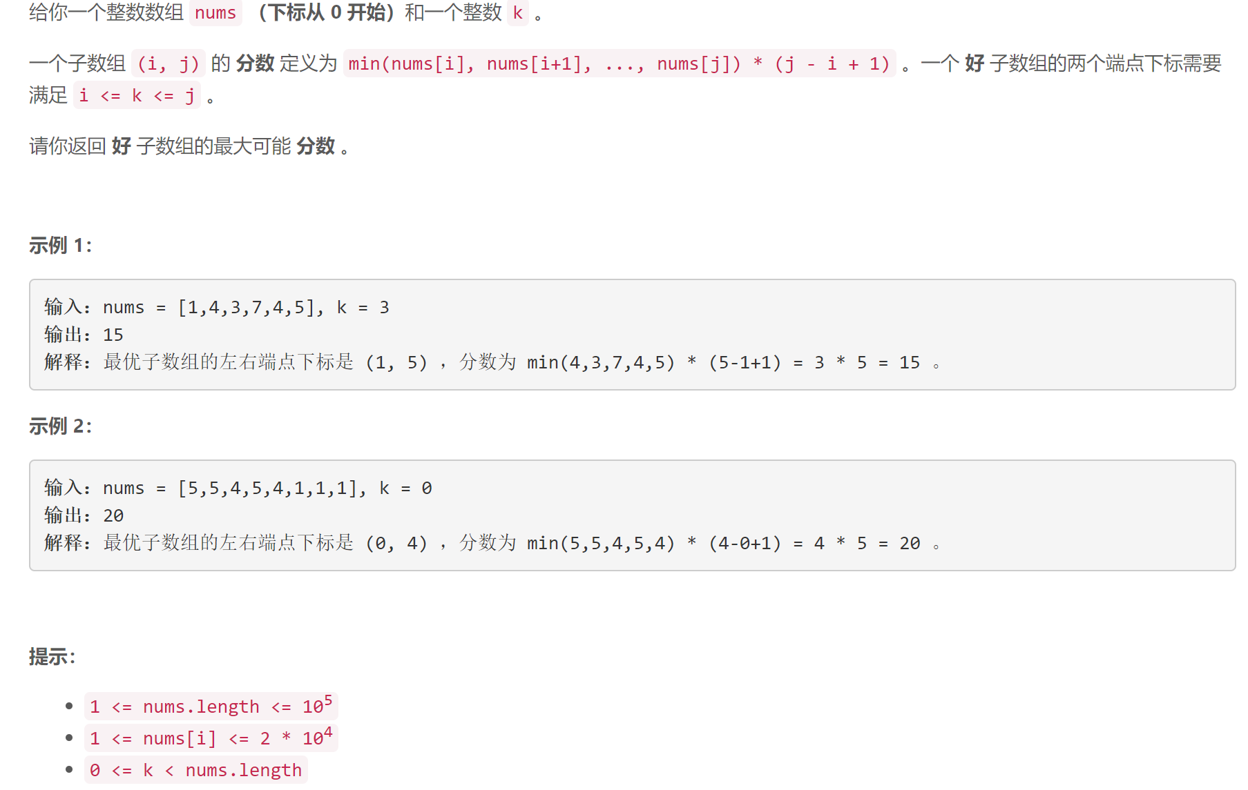 //从k的左右开始循环找,直到找到第一个比当前nums[k]小的停止 作为以当前nums[k]为核心的子数组的最大分数