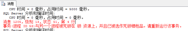 跟着做:打开两个查询窗口,把下面的语句,分别放入2个查询窗口,在5秒内运行2个事务模块。
