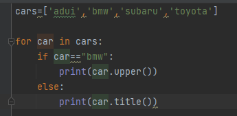 假设你有一个汽车列表,并想将其中每辆汽车的名称打印出来。对于大多数汽车,都应以首字母大写的方式打印其名称,但对于汽车名'bmw' ,应以全大写的方式打印。下面的代码遍历一个列表,并以首字母大写的方式打印其中的汽车名,但对于汽车名'bmw' ,以全大写的方式打印: