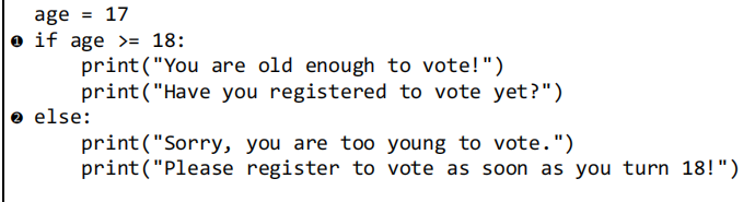 经常需要在条件测试通过了时执行一个操作,并在没有通过时执行另一个操作;在这种情况下,可使用Python提供的if-else 语句。if-else语句块类似于简单的if 语句,但其中的else 语句让你能够指定条件测试未通过时要执行的操作