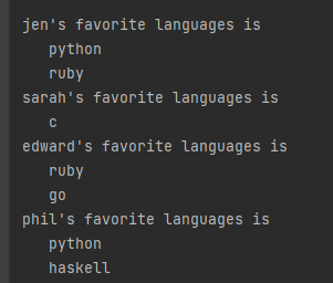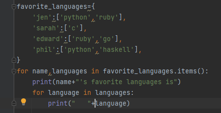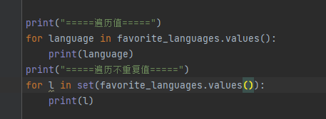 遍历字典时,会默认遍历所有的键,因此,如果将上述代码中的forname in favorite_languages.keys(): 替换为for name in favorite_languages: ,输出将不变。如果显式地使用方法keys() 可让代码更容易理解,你可以选择这样做,但如果你愿意,也可省略它