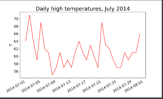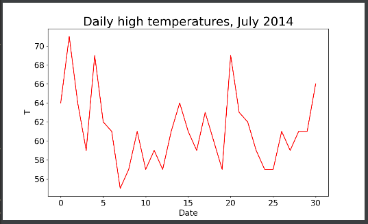 import csv import matplotlib.pyplot as plt filename = 'sitka_weather_07-2014.csv' with open(filename) as f: reader = csv.reader(f) header_row = next(reader) # #打印头文件 # print(header_row) # # #打印头文件及其位置 # for index, column_header in enumerate(header_row): # print(index, column_header) #提取最高气温 highs = [] for row in reader: high = int(row[1]) highs.append(high) print(highs) fig = plt.figure(dpi=128,figsize=(10,6)) plt.plot(highs, c='red') plt.title("Daily high temperatures, July 2014", fontsize=24) plt.xlabel("Date",fontsize=16) plt.ylabel("T",fontsize=16) plt.tick_params(axis="both",which='major',labelsize=16) plt.show()