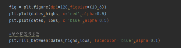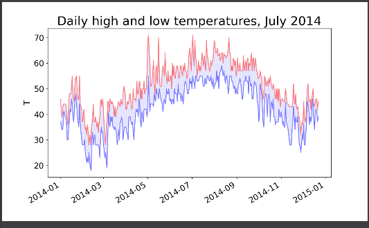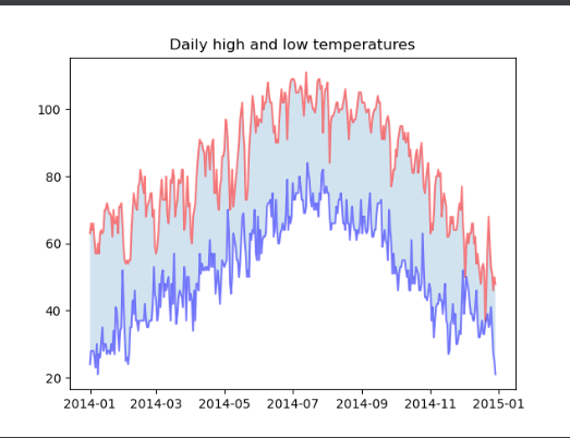 import csv from datetime import datetime import matplotlib.pyplot as plt filename='death_valley_2014.csv' with open(filename) as f: reader = csv.reader(f) header = next(reader) highs = [] lows =[] dates = [] for row in reader: try: date = datetime.strptime(row[0],"%Y-%m-%d") high = int(row[1]) low = int(row[3]) except ValueError: print(date, 'missing data') else: highs.append(high) lows.append(low) dates.append(date) plt.plot(dates,highs,c='red',alpha=0.5) plt.plot(dates,lows,c='blue',alpha=0.5) plt.fill_between(dates,highs,lows,alpha=0.2) plt.title("Daily high and low temperatures") plt.show()