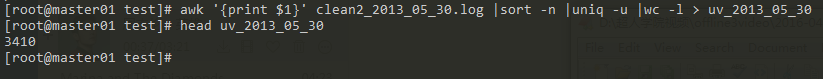 awk '{print $1}' clean2_2013_05_30.log |sort -n |uniq -u |wc -l > uv_2013_05_30