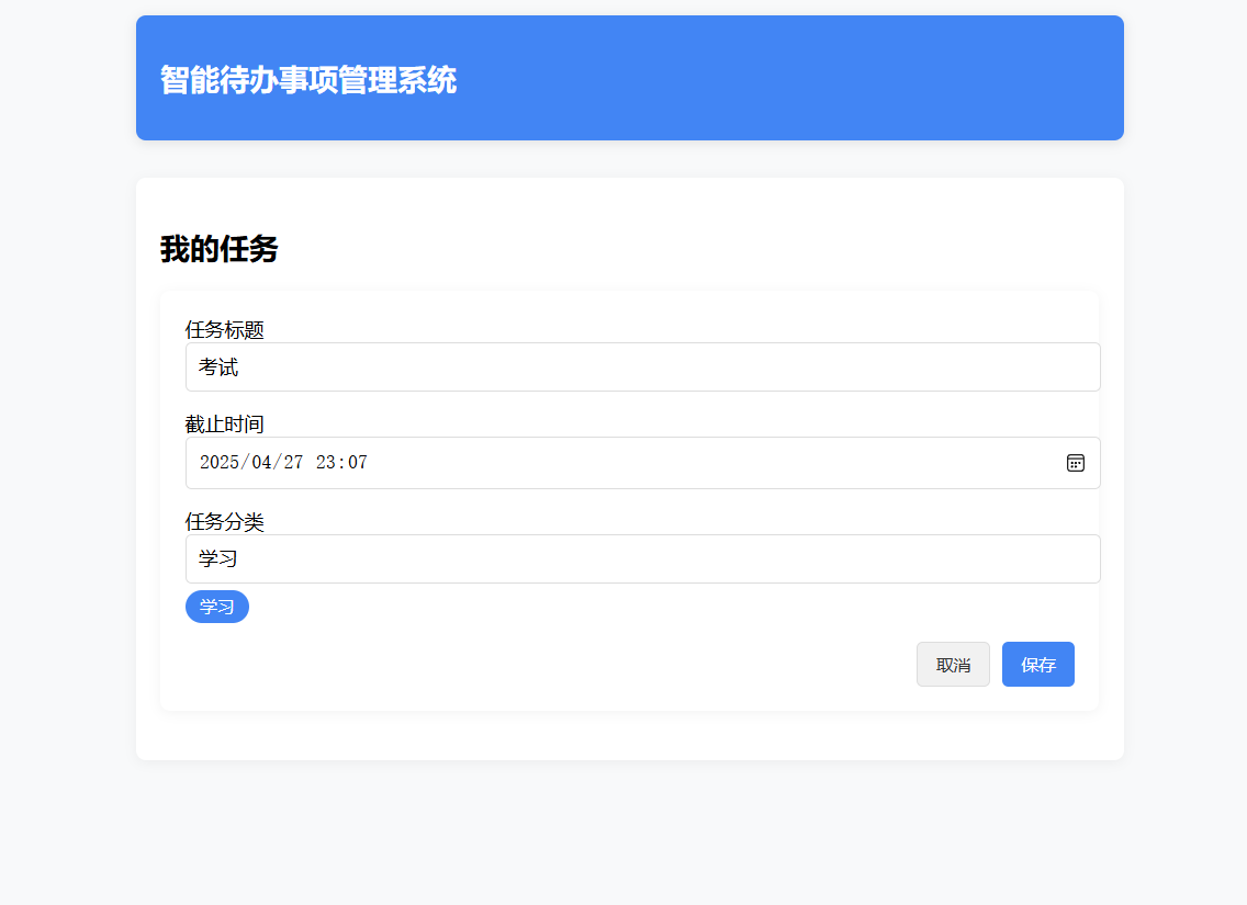 | 前端(黄熙儿、杨子俊) | 在添加任务时,自动显示系统建议的分类,允许用户选择自定义标签。 | |
