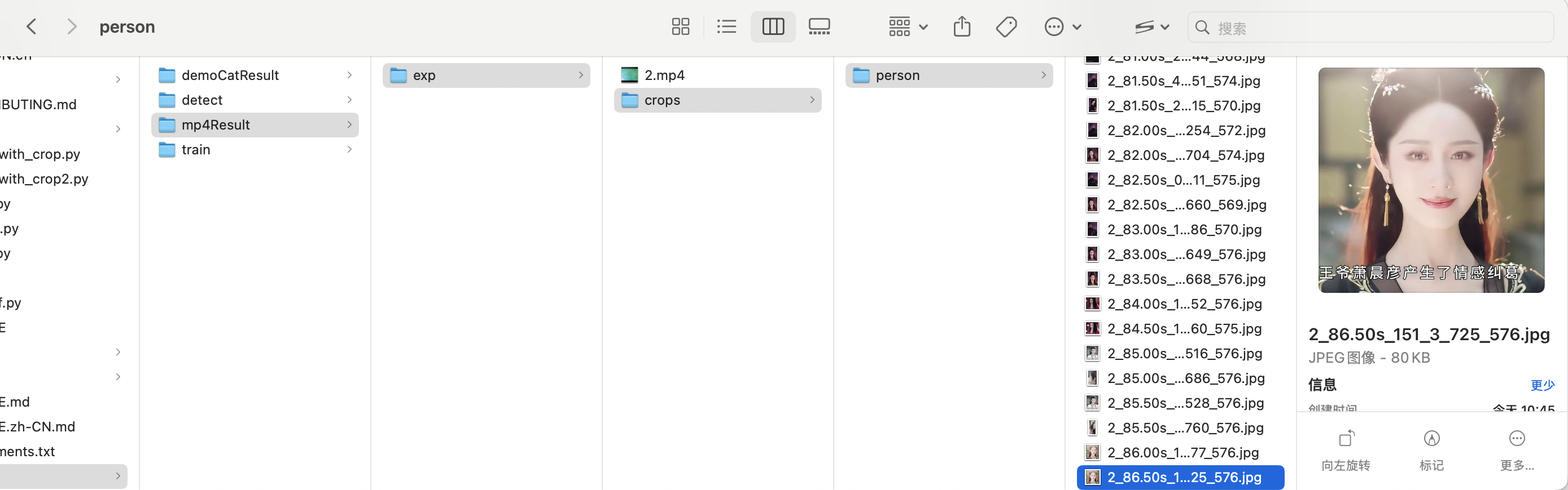 以上面最后一条命令举例,在“runs/mp4Result”目录中生成了在源视频上打标之后的结果。在runs/mp4Result/crops/person内生成了从视频中截取的人物图片。