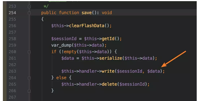 以上代码是用来获取name的参数值并将值里的内容写到session中去,我们来本地搭建一套TP6.0版本的环境,来测试一下生成的session文件会到哪里去。http://测试网址/tp6/public/index.php/index/testsession?name=<?php%20phpinfo();?>当get 访问该页面的时候就会在网站根目录下的runtime文件夹里的session目录下生成一个PHP文件,我们可以看得到。那到底是那段代码导致可以写入文件名的呢?我们仔细看下TP框架里的store.php代码,追踪到253到270行这里,调用了一个参数来进行写入文件的操作,writefile($filename,$data)我们来追踪下这个函数接下来使用到是哪里的值,看下图: