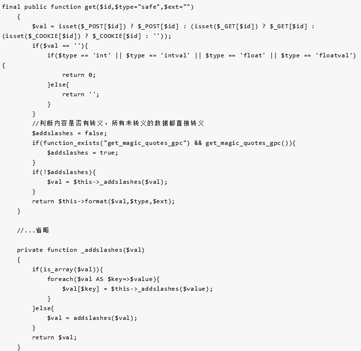 不同入口传入过来的值,并进一步的操作都不一样,我们SINE安全技术在get,post,cookies的请求方式中,发现一个规律,在查看代码中发现都是使用的get()的方式来对传入过来的值进行安全效验与拦截.对一些特殊符号包括<> 都进行了安全转义,不会直接输入到后端中去.基本上的一些漏洞,XSS,SQL注入漏洞是不会很容易的找到.我们继续对代码进行分析与渗透测试,对漏洞多次的测试,终于找到一处存在SQL注入漏洞的代码,存在于网站的会员头像上传功能.