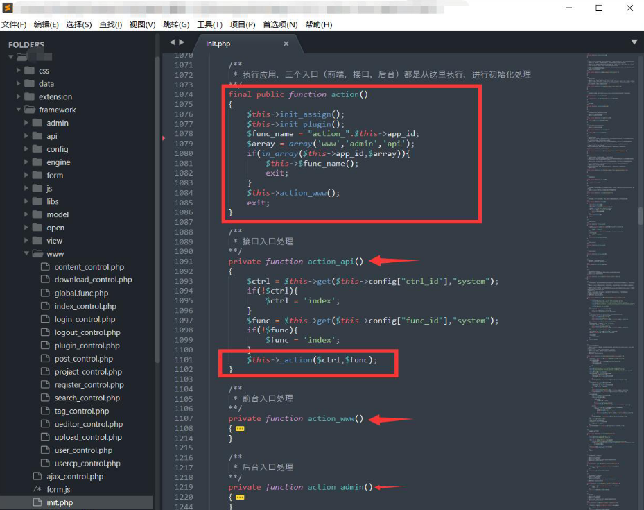 首先客户网站和APP的开发语言都是使用的PHP架构开发,后端使用的thinkphp开源系统,对会员进行管理以及资料的统计,包括充值,提现,下单功能.服务器使用是linux系统.共有3个接口,分别是WEB前端,接口,后台,都采用的是action的方法来调用,并初始化数据.我们看下代码