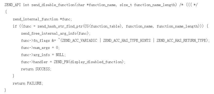 PHP中Disable Function的实现是在php-src/Zend/Zend-API.c中。PHP在启动时,读取配置文件中禁止的函数,逐一根据禁止的函数名调用 zend_disable_function 来实现禁止的效果。