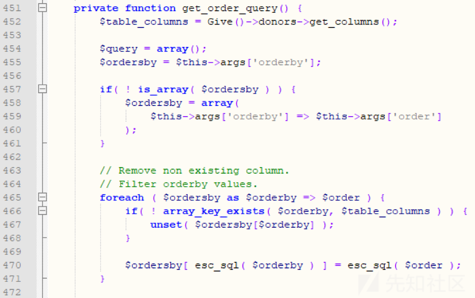give插件,也存在漏洞,漏洞产生的原因是includes目录下的donors文件夹里的class-give-donors-query.php代码,在获取订单的函数中,没有对其order by字符进行拦截,导致sql代码可以到后端进行查询数据库,导致sql盲注。代码如下: