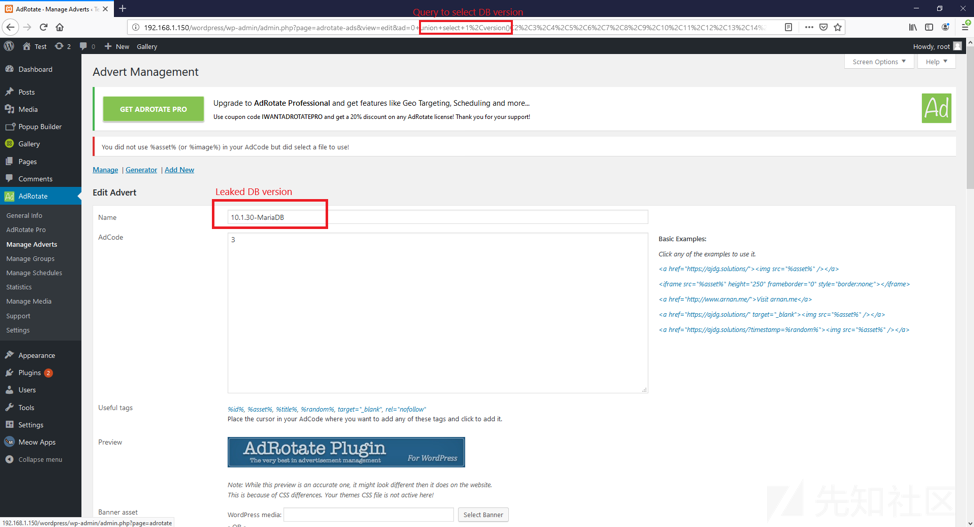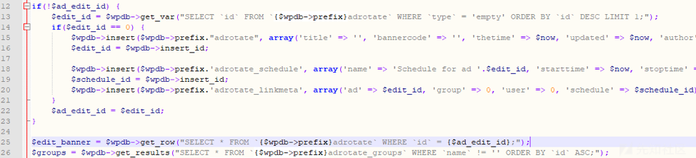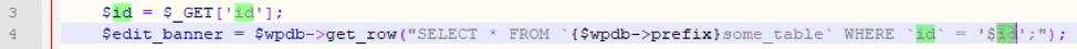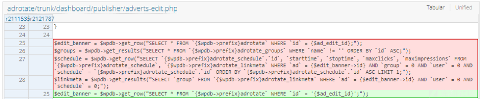 在前端进行输入的时候,可以插入恶意的sql注入代码,如果后端没有对前端输入进来的参数值进行安全过滤拦截,那么就会导致sql注入漏洞的发生,我们来看上面的一段代码。该代码在写的时候,会将get中的ID,传入后数据库中进行查询,没有做任何的安全过滤导致sql注入,在wordpress最新版中以及将get、post、cookies、提交的方式进行了安全拦截,对一些非法的字符与sql注入攻击语句加强过滤,但是还是被绕过,导致sql注入的发生,就拿adrotate插件来说,在dashboard目录下的publisher文件夹下的adverts-edit.php代码中第46行: