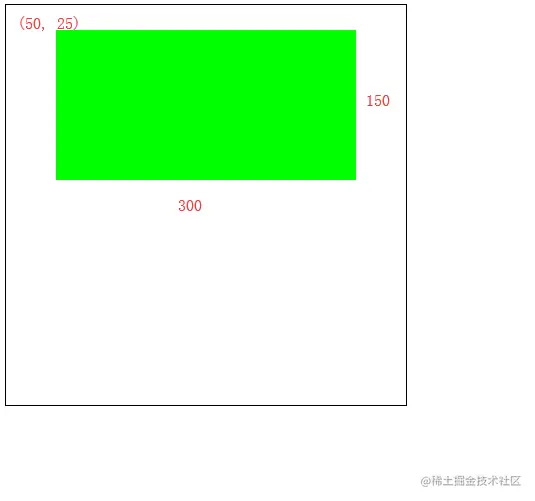 context.fillRect(50,25,300,150); // 填充矩形 (起点x坐标, 起点y坐标, 宽度, 高度)