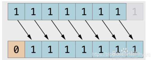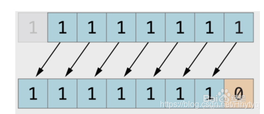 下图展示了11111111 << 1(11111111 左移一位)的结果。蓝色数字表示被移动位,灰色表示被丢弃位,空位用橙色的0填充。