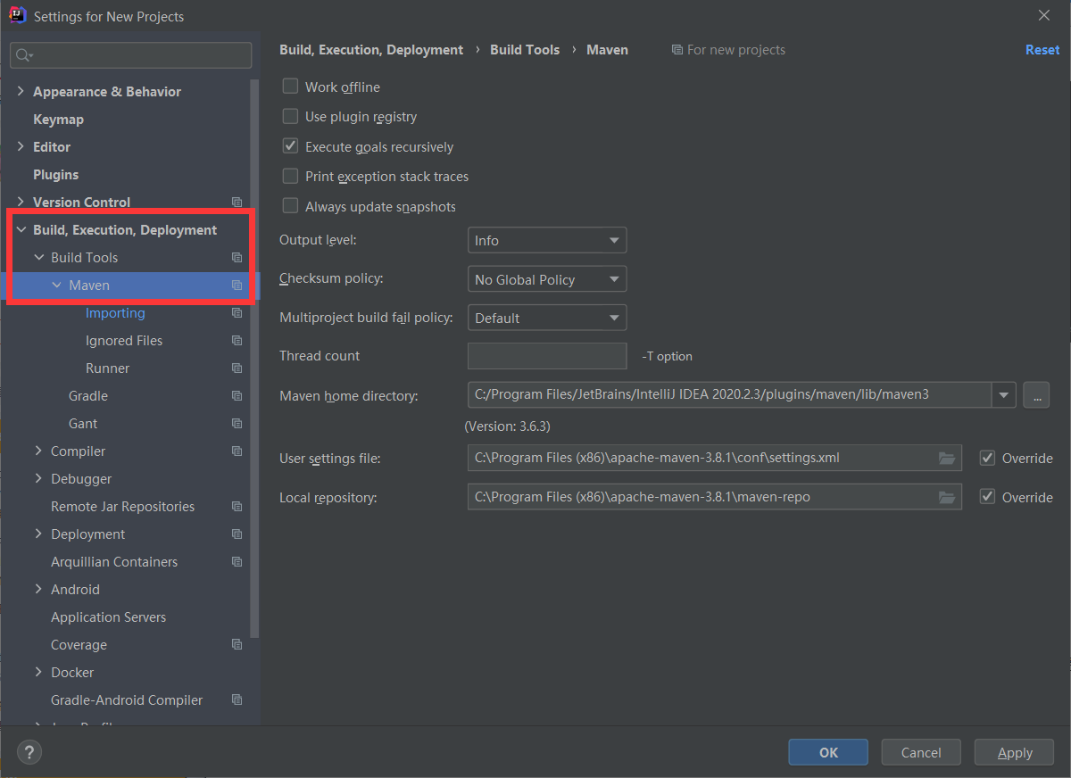 只需要在这里设置Maven的路径和其他设置,就不会有创建新项目时,Maven的配置全部恢复默认的情况。