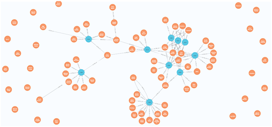 下面是我们的Neo4j数据库可视化之后的示例图。每一个圆圈里面是实体及其属性,连接两个实体的带箭头实线记录实体之间的关系。由于在我们的项目中有根据小程序用户提问给出答案的需求,即根据关键词和关系找出其他的关键词;而neo4j数据库的一项优势在于它存储了原生的图数据,可以使用图结构的自然伸展特性来直接进行图的遍历算法设计,即从一个节点开始,根据其连接的关系,可以快速和方便地找出它的邻近节点。这种查找数据的方法并不受数据量的大小所影响,因为邻近查询始终查找的是有限的局部数据,不会对整个数据库进行搜索。所以,我们根据自己的需求合理地运用了Neo4j这样查询高效的特性。