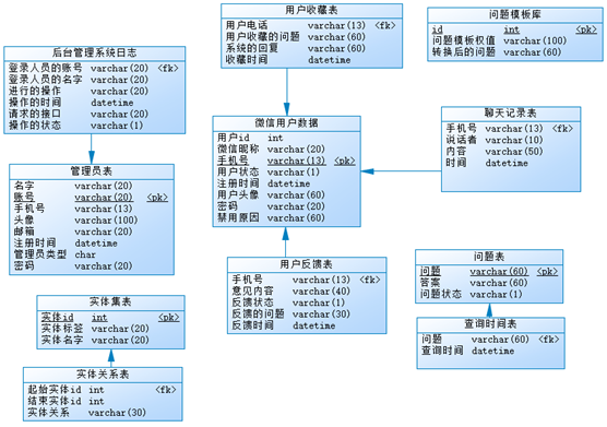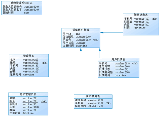 最初我们的数据库包含了7个表,分别是和后端相关的后台管理系统日志表,和网页端数据库管理相关的管理员表、超级管理员表,和移动端微信小程序相关的微信用户数据表、用户禁用表、用户反馈表、聊天记录表,模型长下面这个样子: