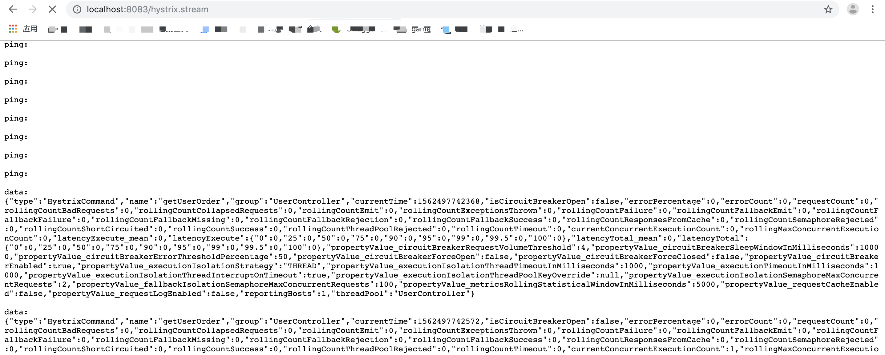 服务启动后,在浏览器输入ip:port/hystrix.stream,可以看到下图所示的内容,说明启动成功