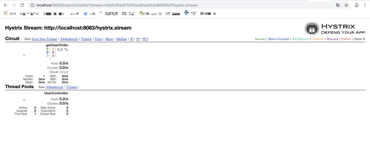 在第一个红框处,输入ip:port/hystrix.stream,指定dashboard监控的地址,然后点击Monitor Stream即可,会出现如下图所示的界面,表示dashboard配置成功。