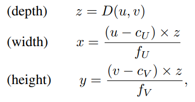 在左图的相机坐标系中为每个像素(u,v)反投影的到3D坐标(x,y,z):((cU,cV)是像素坐标原点相对与相机中心的位置偏移,fV是垂直焦距)。将所有的像素点都反投影到3D坐标,得到3D点云{(x(n),y(n),z(n))}Nn=1(N为像素数目)。
