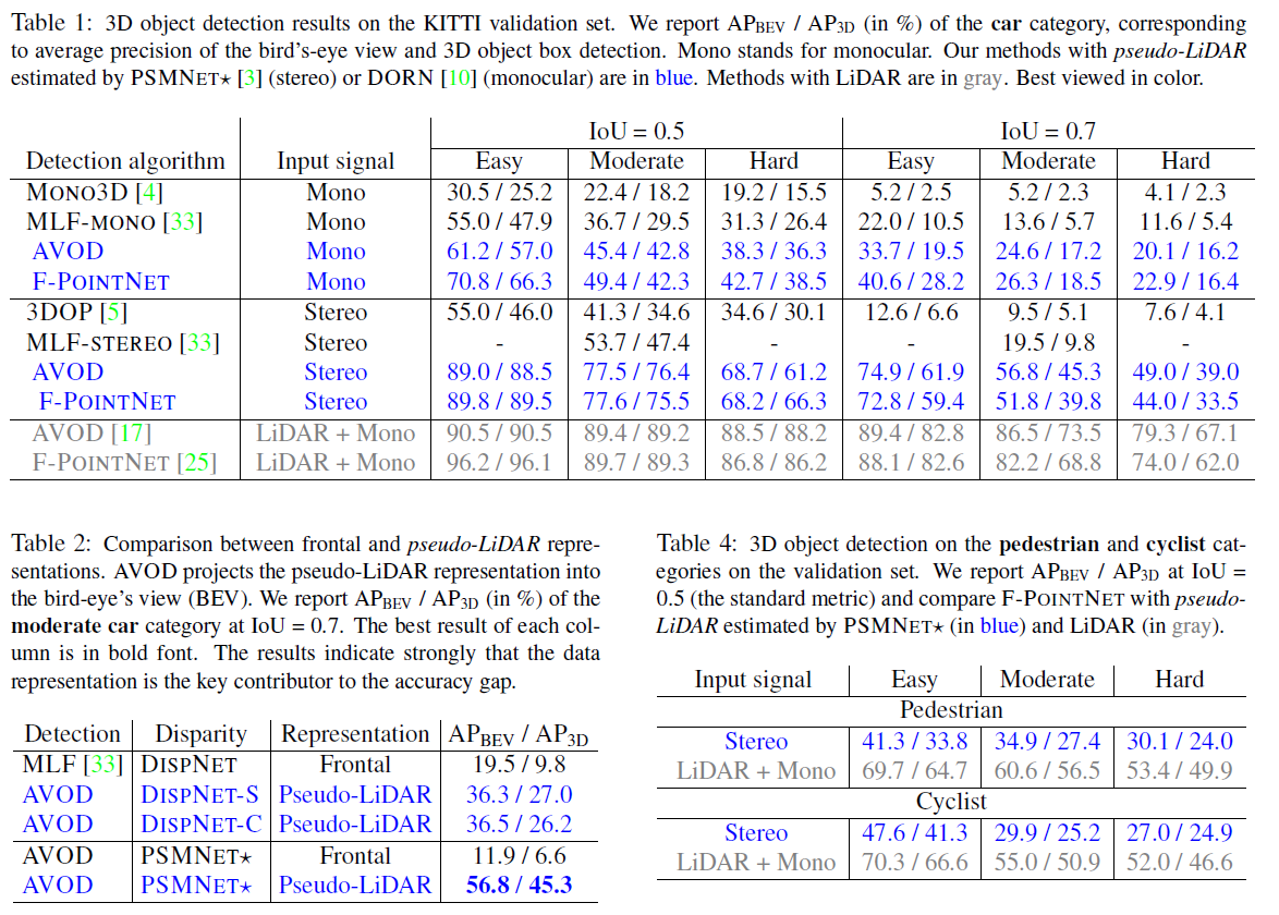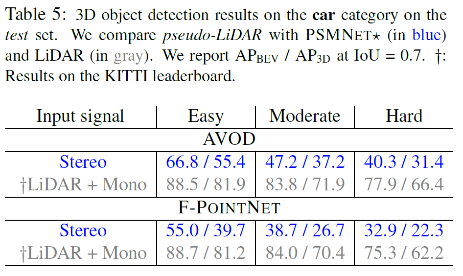 减小深度估计的误差依旧非常重要:随着难度的增加,pseudo-LiDAR的结果会下降。