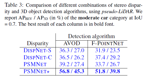 单目深度估计不可靠:文中实验,单目深度估计网络DORN用10倍于双目深度估计(PSMNet)图片数量的数据集进行训练,但是双目得到的效果更好(表1中蓝色数据的对比)。