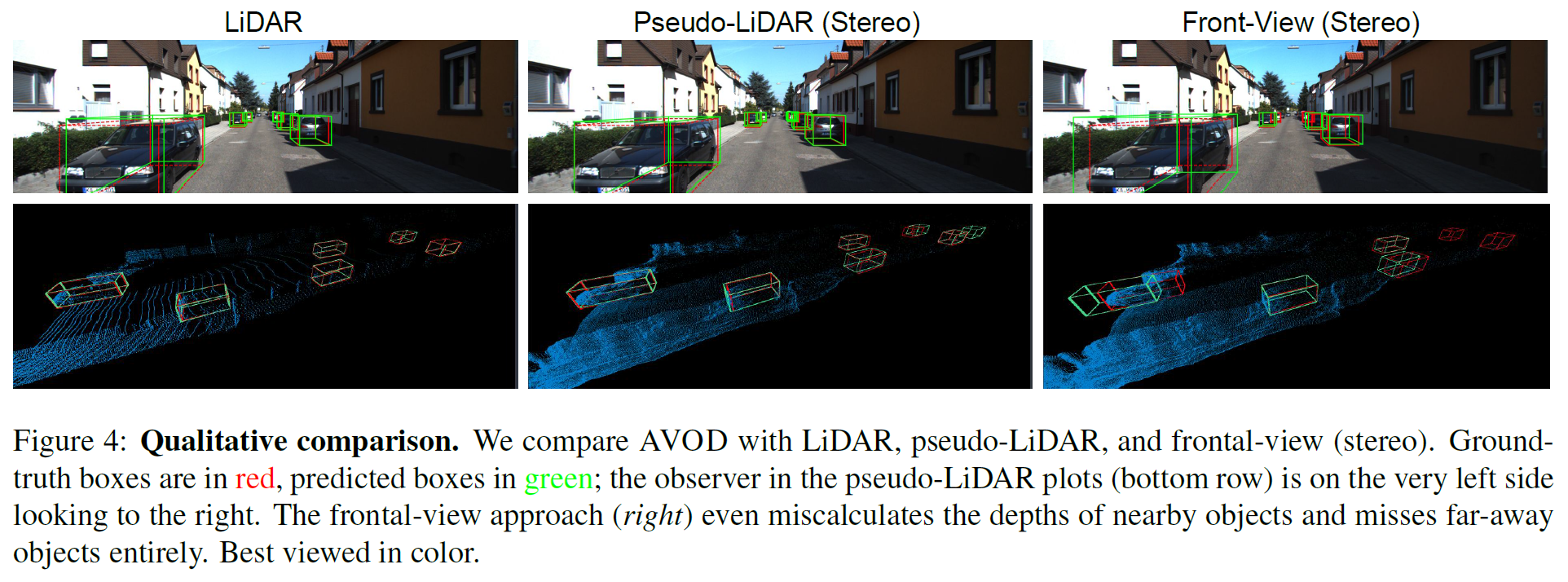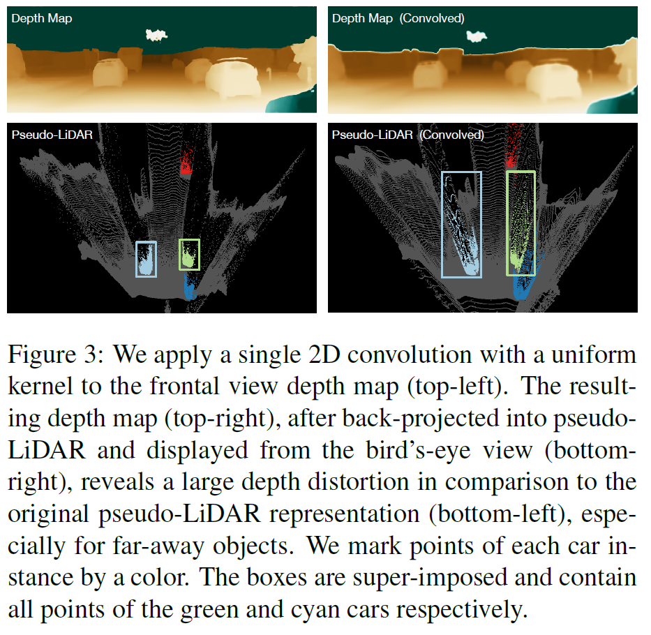 相反,点云上的3D卷积或者BEV视角上的2D卷积在物理上自然靠近(尽管BEV会将不同高度的像素堆叠到一起,但是这些像素通常你都属于同一物体,不影响)。这样,远处物体和近处物体可以用完全相同的方式处理,这些操作本质上更具有物理意义,自然地可以得到更精确的结果。做了对比实验来验证这点(2D卷积操作有时侯不太靠谱)(图3):左侧是原始深度图和其得到的pseudo-LiDAR数据;右侧深度图是左侧经过一个11 * 11 的卷积层得到的,下面是其得到的pseudo-LiDAR数据。