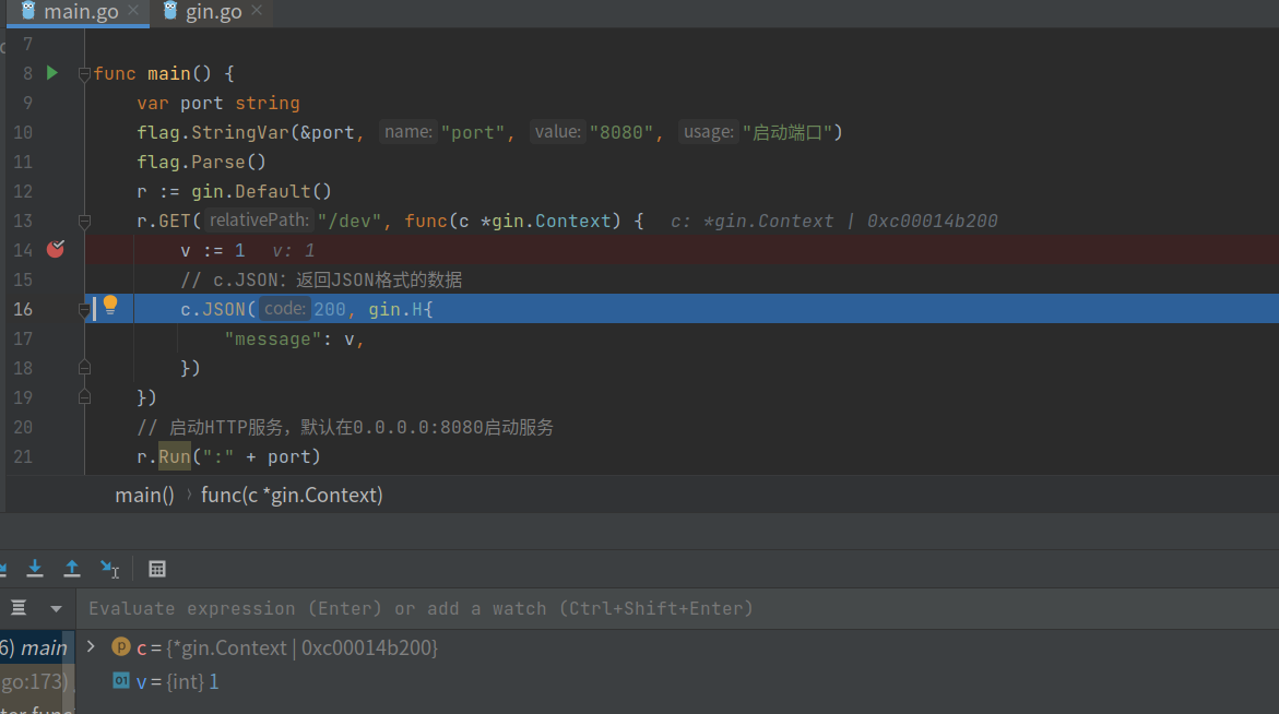 - 在Goland打上断点并启动调试(快捷键:Shift + F9(ubuntu)),启动调试后,服务器会开启相应web服务