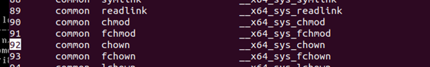 如图92号系统调用,92对应的系统调用为__x64_sys_chown,其对应的API函数为chown。