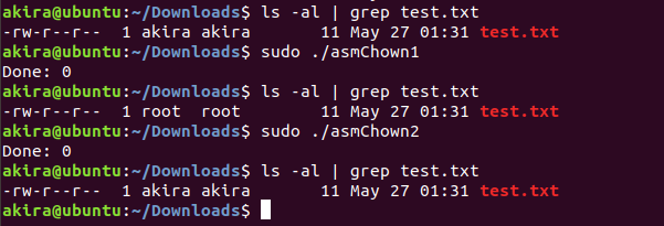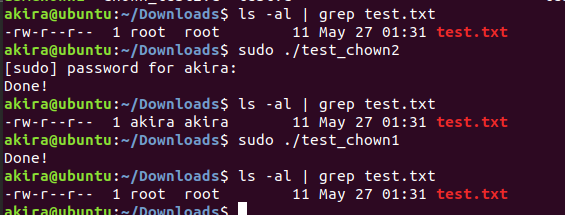 #include <stdio.h> #include <sys/types.h> #include <unistd.h> int main(){ chown("/home/akira/Downloads/test.txt", 0, 0); printf("Done!\n"); return 0; }