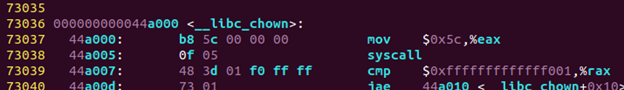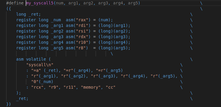 #include <stdio.h> #include <sys/types.h> #include <unistd.h> int main(){ char path[] = "/home/akira/Downloads/test.txt"; int ret = -15; unsigned int owner = 1000, group = 1000; //chown("/home/akira/Downloads/test.txt", 0, 0); // unsigned long number = 92; asm volatile( "movq %1, %%rdi\n" "movq %2, %%rsi\n" "movq %3, %%rdx\n" "movl $0x5c, %%eax\n\t" "syscall\n\t" "movq %%rax,%0\n\t" :"=m"(ret) :"p"(path), "m"(owner), "m"(group) //:"rax", "rdi", "rsi", "rdx" ); //if(ret) printf("Done: %d\n", ret); return 0; }