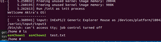 首先将之前的编译好的asmChown1和asmChown2以及测试文件test.txt复制到rootfs/home/ 目录下,然后重新打包文件系统