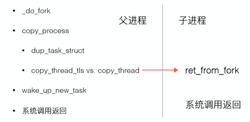 - copy_thread 中还干了一件事,就是把0值写入到寄存器中,然后将指令指针指向一个汇编函数 ret_from_fork 。所以在子进程运行的时候,虽然代码和父进程的代码是一致的,但是还是有些区别。在 copy_thread 完毕后,没有返回到 do_fork ,而是跳到 ret_from_fork ,进行一些清理工作,然后退出到用户空间。用户空间函数可以通过寄存器中的值得到 fork 系统调用的返回值为0。