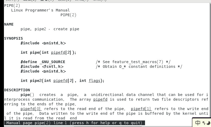 它的参数是一个大小为 2 的数组。此数组的第 0 个元素用来接收以读的方式打开的描述符,而第 1 个元素用来接收以写的方式打开的描述符。也就是说, pipefd[0] 是用于读的,而 pipefd[1] 是用于写的。