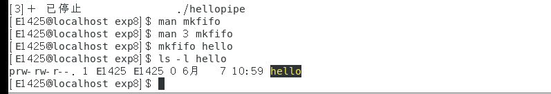 当使用 mkfifo 创建 hello 文件后,查看文件信息如下: