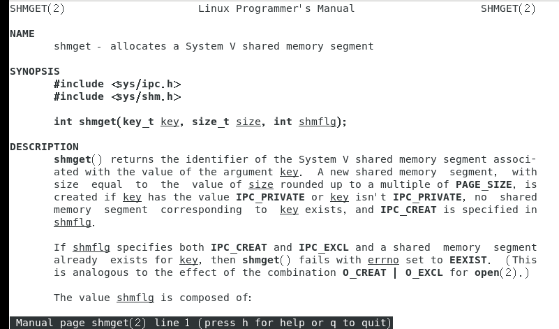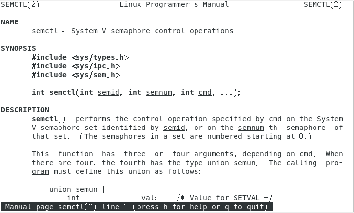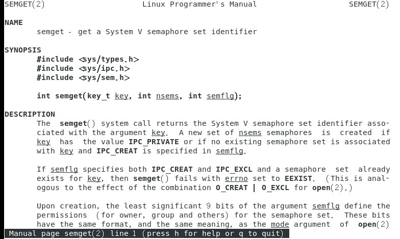 #include <unistd.h> #include <sys/ipc.h>#include <sys/shm.h> #include <sys/msg.h>#include <sys/sem.h> #include <stdio.h> #include <stdlib.h> #include <string.h> int main(int argc, char* argv[]) { if (argc < 3) { printf("%s <ipc type> <key>\n", argv[0]); return -1; } key_t key = strtoll(argv[2], NULL, 16);//key char type = argv[1][0];// char buf[64]; int id; if (type == '0') {//创建共享内存 id = shmget(key, getpagesize(), IPC_CREAT | IPC_EXCL | 0644); strcpy(buf, "share memory"); } else if (type == '1') {//创建消息队列 id = msgget(key, IPC_CREAT | IPC_EXCL | 0644); strcpy(buf, "message queue"); } else if (type == '2') {//创建信号量 id = semget(key, 5, IPC_CREAT | IPC_EXCL | 0644); strcpy(buf, "semaphore"); } else { printf("type must be 0, 1, or 2\n"); return -1; } if (id < 0) { perror("get error"); return -1; } printf("create %s at 0x%x, id = %d\n", buf, key, id); return 0; }